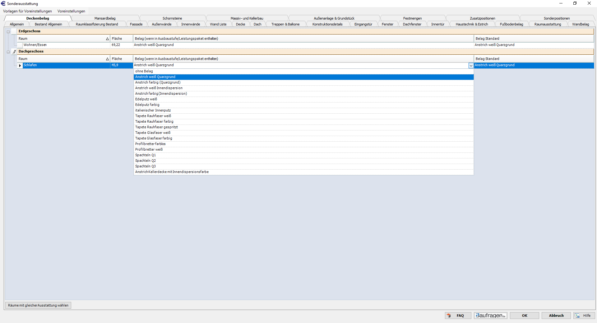 Im Raumdialog kann für den Abriss des Belages der Decke neben dem Material selbst - hier Holzverkleidung - zusätzlich vereinbart werden, dass der Unterbau unter des Deckenbelags des Raums (= die Deckenbekleidung/Gipsputz je Deckenkonstruktionsart) mit abgerissen werden soll. In diesem Fall steht hinter dem Material mit "/" noch "Unterbau" in der Auswahl. Der Abriss wird in einer Position kalkuliert. Bei Transport und Entsorgung werden alle abgerissenen Materialien separat kalkuliert, wobei der Grundputz nicht separat kalkuliert wird. Die Einstellung des Materials als Gefahrenklasse - GFK - führt bei der Dachbekleidung - Register Decke - automatisch zur Berücksichtigung von asbesthaltigen Baustoffen.